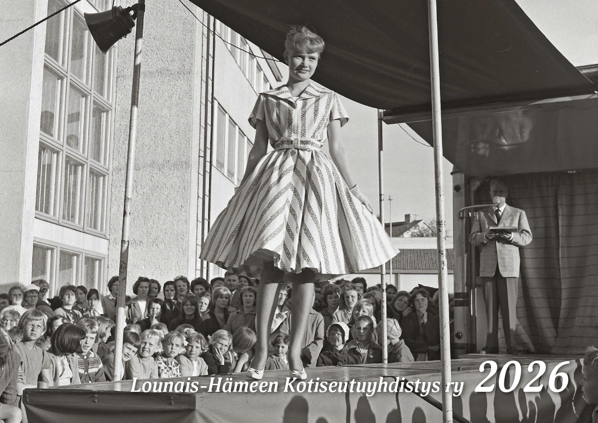 Lounais-Hämeen Kotiseutuyhdistyksen vuoden 2026 seinäkalenterin teemana on 1900-luvun muoti- ja vaatetus. Liikkeelle lähdetään 1910-luvulta ja päädytään 1970-luvulle. Kansikuva aloittaa matkan 1950-luvun muodin esittelyllä tavaratalo Hämeenkulman pihalla. Kalenterissa on arkipäivän kuvia niin vapaa-ajalta kuin työstäkin. Kesäisenä päivänä 1910-luvulla nautitaan kesän lämmöstä ja 1920-luvulla valmistaudutaan ottamaan asiakkaat vastaan työväentalon pilarisalin ravintolassa. 1930-luvulla juhlitaan Saaren kansanpuistossa Norjan kuninkaallisten kanssa. Sota-aikana poseerataan parhaimpiin puettuina valkovuokkojen kukkiessa. Wiksbergin kartanon pallolla korjuuväki on kokoontunut valokuvaan. 1950- ja 1960-luvuilla ollaan uusia vaateita katsomassa muotinäytöksessä, valmistaudutaan lasten hiihtokilpailuun ja ollaan muhkeaan moottorisahaan tutustumassa. Joulua odotellaan Osuusliike Tammen uudessa myymälässä. Forssan vilkkaalla torilla seurustellaan 1970-luvulla muodikkaissa mekoissa ja liikennevalojen vaihtumista odotellaan Koskisillan valoissa. Takakannessa saa ihailla Forssan keskustaa 1970-luvulla.